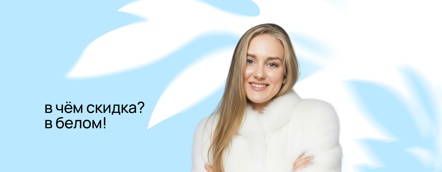 Скидку даем за всё: предметы одежды, аксессуары, варианты макияжа в белом цвете, цвет волос и маникюра. Создаём белоснежную сказку вместе с Улыбкой!