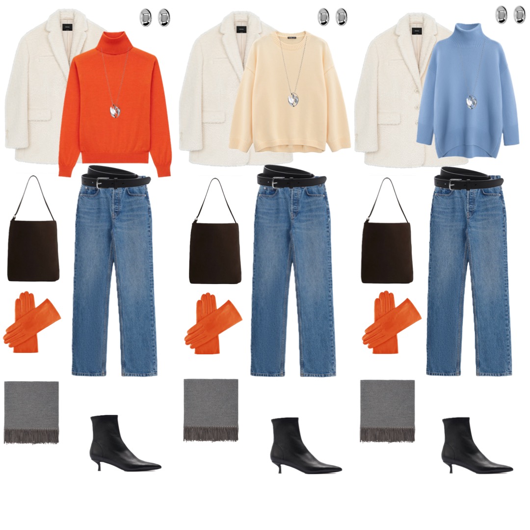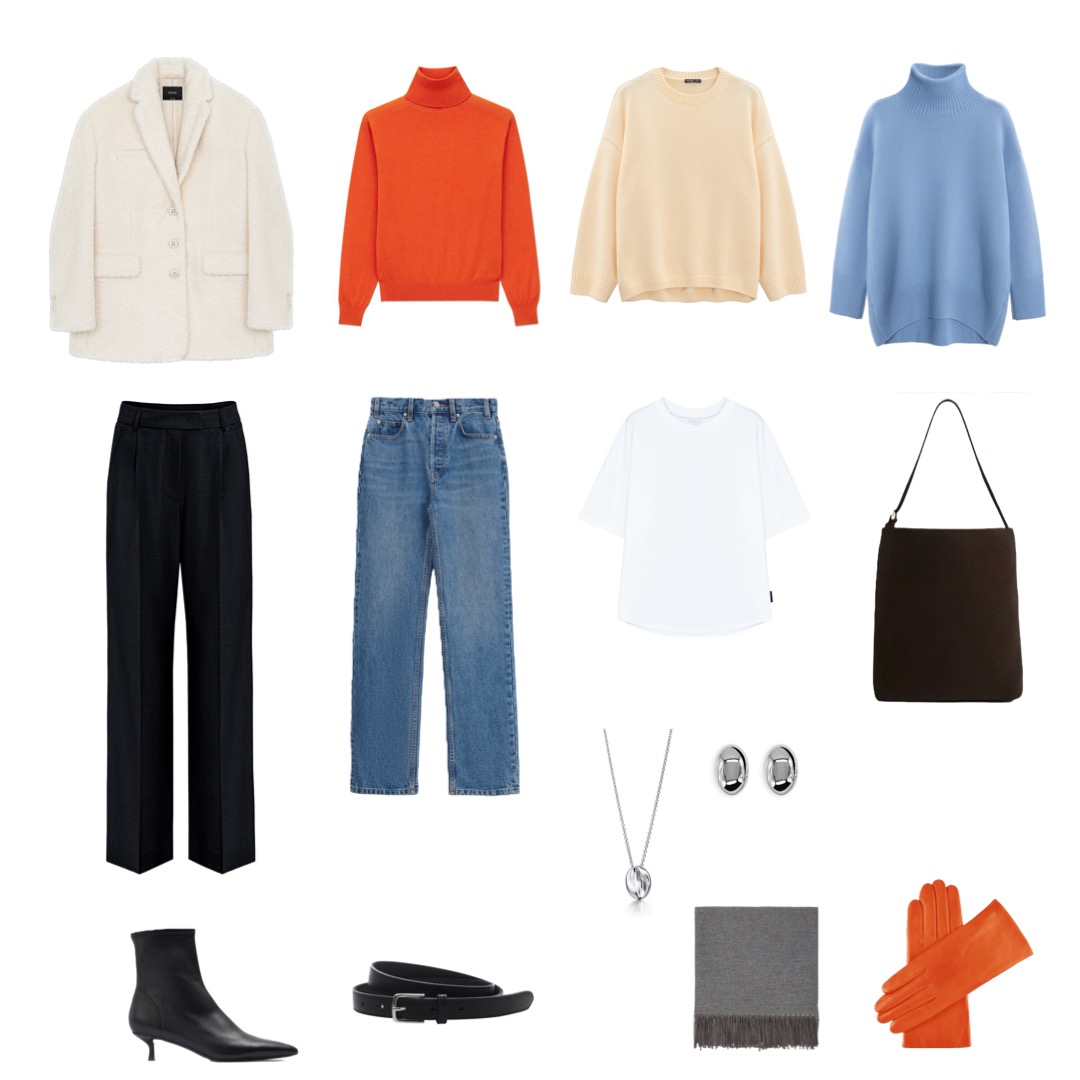 4 плечевых изделия хорошо сочетаются, как с брюками, так и с джинсами. Так как капсула у нас повседневная, то мы можем добавить в нее чуть больше цвета: яркий трикотаж точно скрасит хмурые осенние дни.