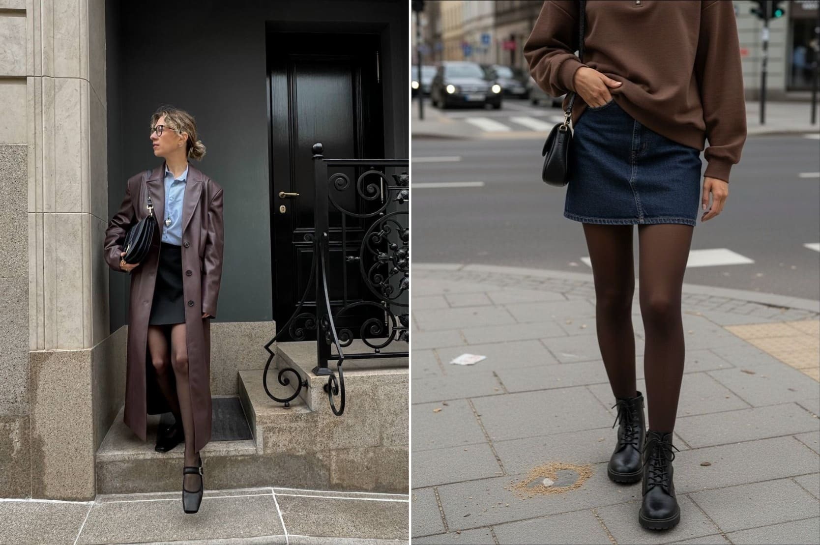 Чёрные колготки часто выглядят мрачно, а с телесными трудно угадать оттенок, который подойдёт под цвет кожи. Колготки в кофейных и шоколадных оттенках — универсальный вариант, который подходит почти всем и выглядит интересно.