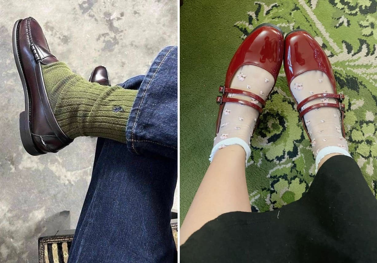 Балетки и туфли Мэри Джейн. Здесь подойдут тонкие носки со сборкой, если хочется получить женственный образ или белые носки в рубчик для образа в стиле преппи — школьной эстетики.