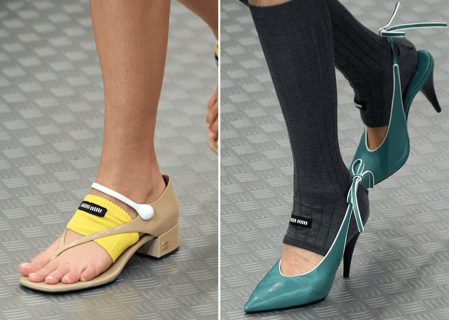 Туфли на каблуке. Носки с элегантной обувью — один из главных трендов сезона. Можно подобрать самые эклектичные сочетания, например, выбрать спортивные носки. Или трендовые носки с открытыми пальцами, микроноски в стиле Miu Miu. Но важно помнить об уместности и деликатности такого приёма. Для вечернего выхода с юбкой или платьем, подойдут носки с люрексом или прозрачные.